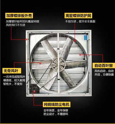 鍍鋅板式負壓風(fēng)機也叫負壓抽風(fēng)機,鐵皮風(fēng)機及畜牧風(fēng)機是蘇州速吉鍍鋅板抽風(fēng)機在吸取同類產(chǎn)品優(yōu)點的基礎(chǔ)上,開發(fā)研制的實用新型畜牧風(fēng)機,該系列風(fēng)機具有全壓低、風(fēng)量大、噪音低、節(jié)能、運轉(zhuǎn)平穩(wěn)、百葉窗自動啟閉、維修方便等特點。