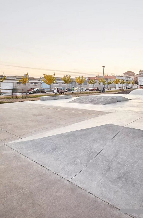 成排的綠樹為滑板公園提供必要的樹蔭遮擋,也在滑板區與其他公共空間之間劃定界限,傾斜的坡道以綠植鋪面,分層的場地為滑板節及各種體育活動提供了理想的場地。綠植覆蓋避免了一些不受歡迎的涂鴉同時增加美感,花崗巖巧妙的圍合滑板區域。